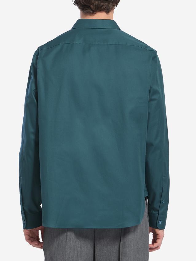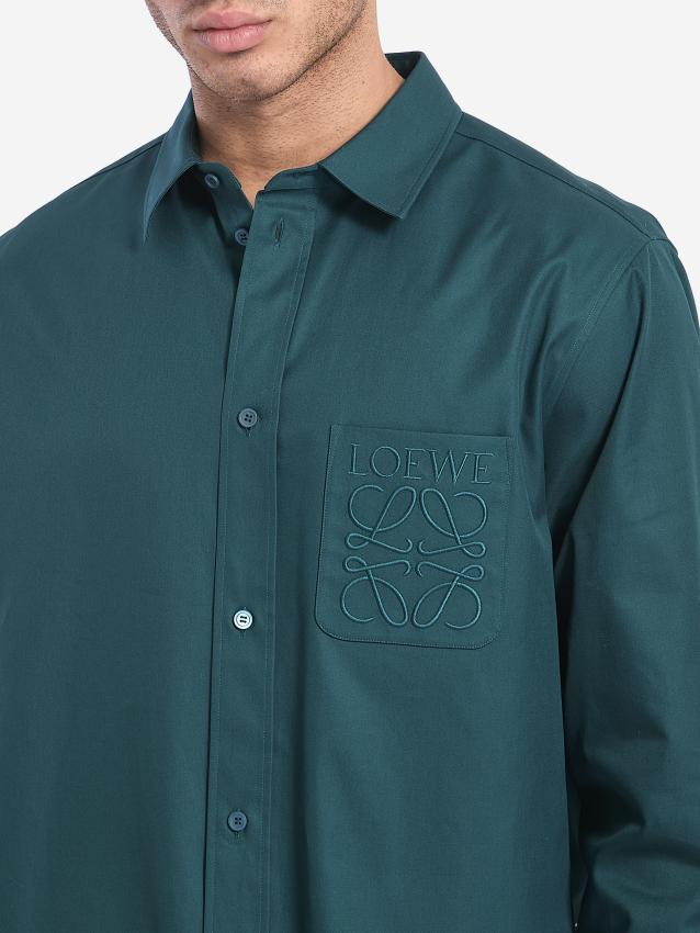 Shirt in compact mid-weight dark green cotton. It features a pointed collar, button closure, an applied pocket with a tonal embroidered Anagram motif