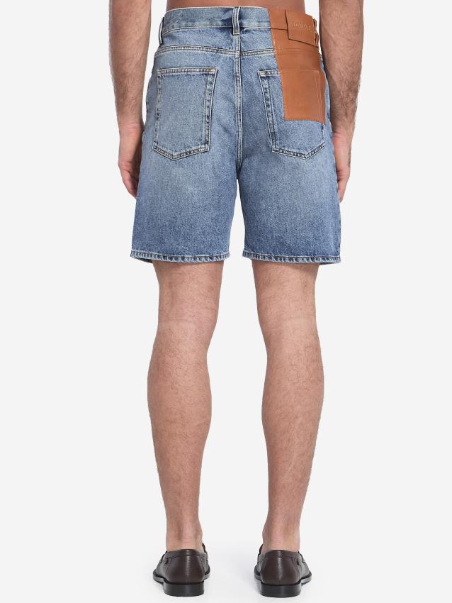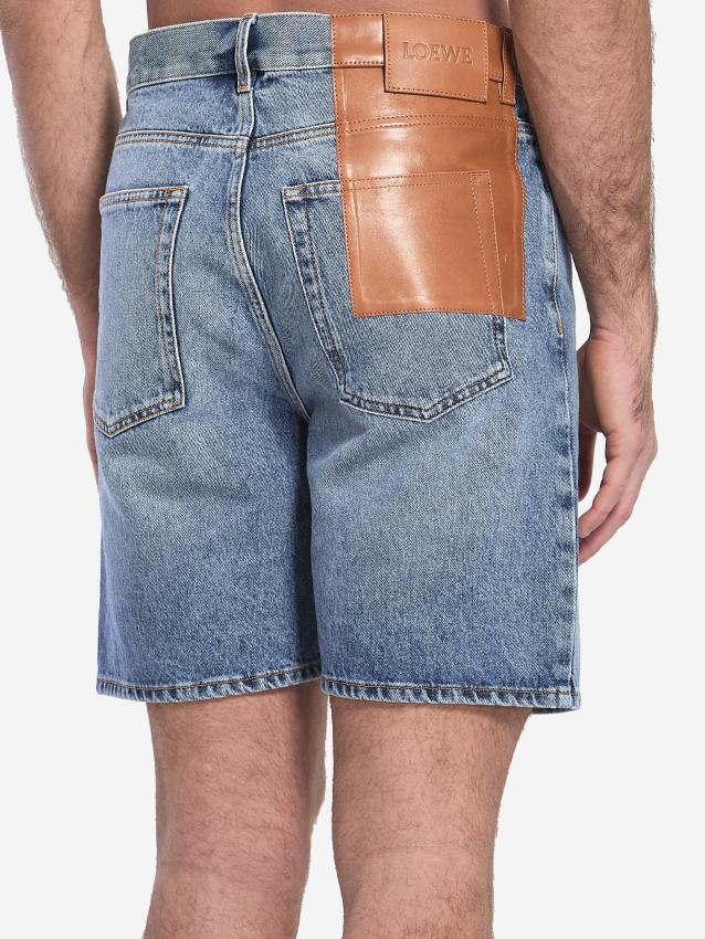 Blue cotton denim bermuda shorts. They feature a button closure, five pockets, belt loops, a brown leather insert on the back of the right leg, and a