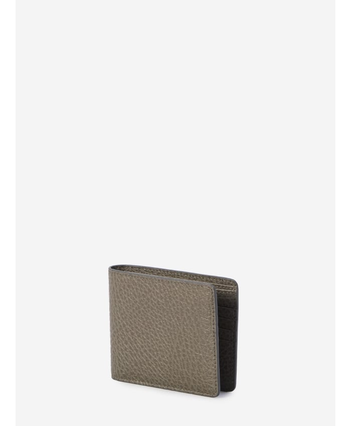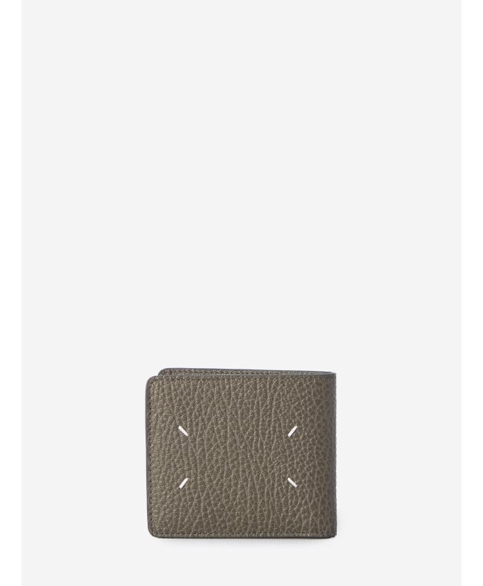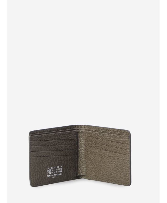 Bi-fold wallet in grey grained leather with four seams detailing at the back and embossed numerical logo on the inside. It features two bill