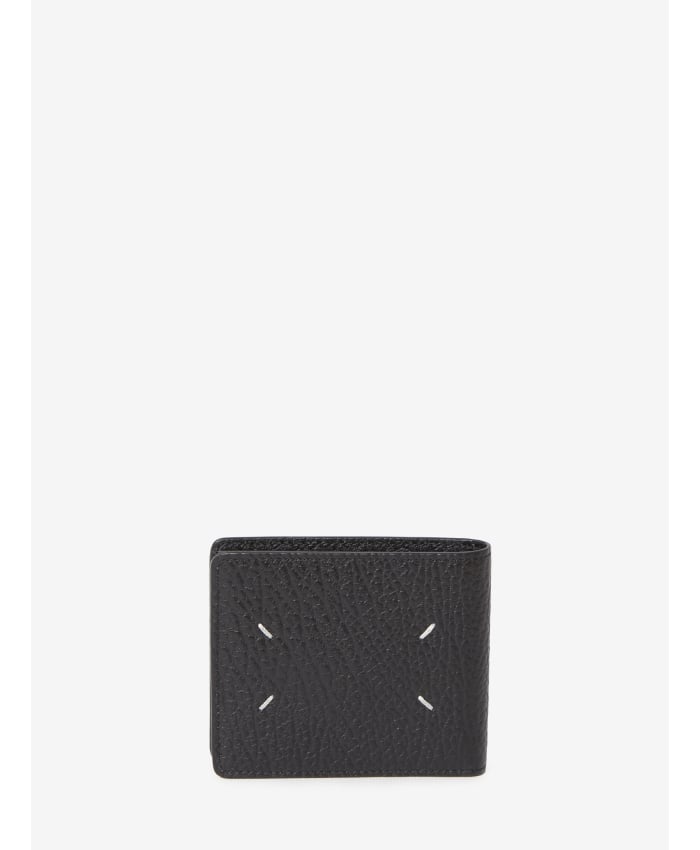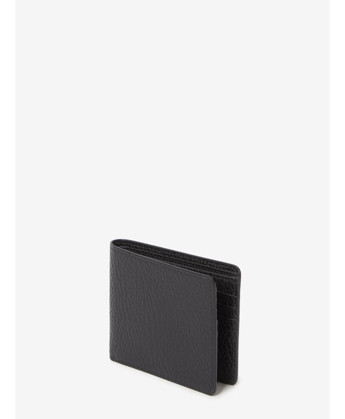 Bi-fold wallet in black grained leather with four seams detailing at the back and embossed numerical logo on the inside. It features two bill
