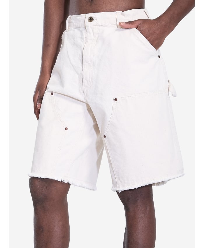 Cotton denim shorts in cream with stud detailing. They feature a hook, button, and zip closure, belt loops, five pockets, two faux pockets on the