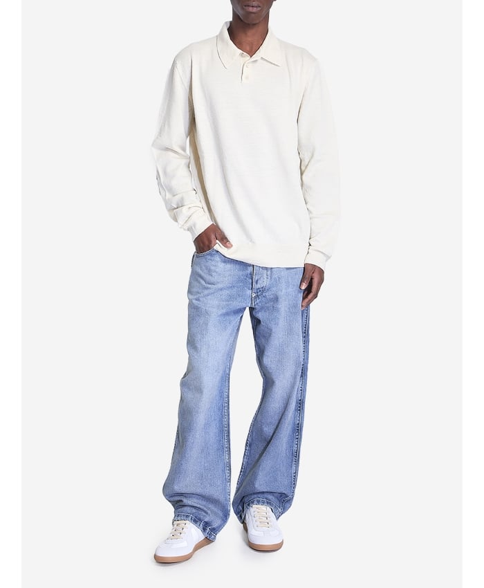 Long-sleeve polo shirt in cream-colored wool. It features a classic collar, a three-button placket, beige suede elbow patches, signature Four