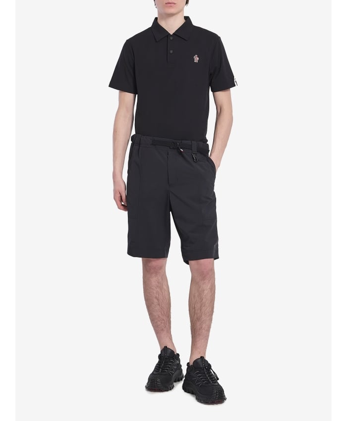 Short-sleeve polo in black pique cotton. It features a classic collar, a front placket with buttons, and a Moncler Grenoble patch on the chest.