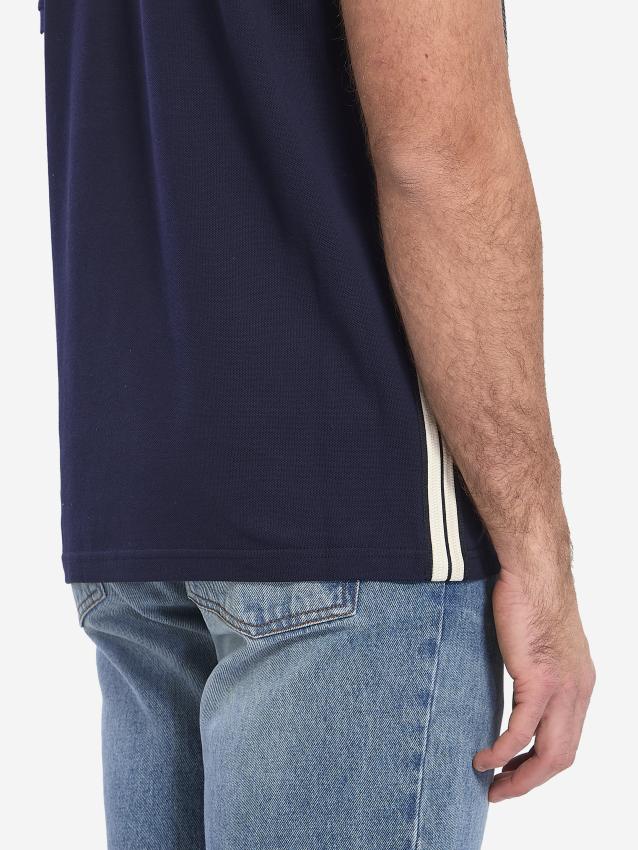 Navy blue cotton pique short-sleeve polo shirt. It features a classic collar with a placket and three buttons, a Moncler logo patch on the