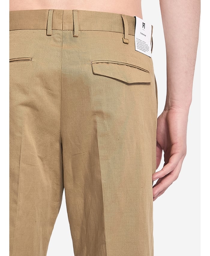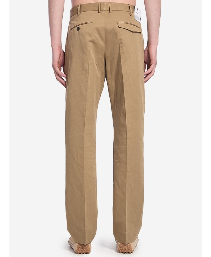 Khaki cotton and linen Michael trousers. They feature a button closure, belt loops, two side pockets, one welt back pocket with a button, one back