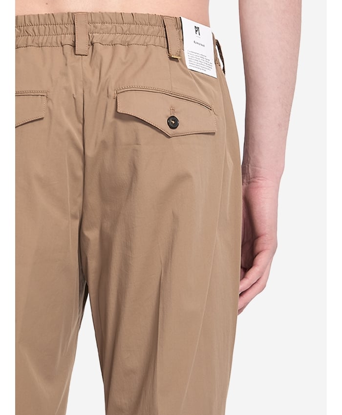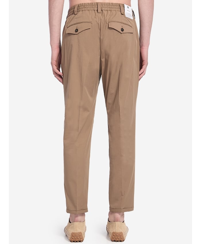 The Rebel trousers in brown cotton blend. They feature an elasticized waistband, button closure, belt loops, two welt side pockets, and two flap