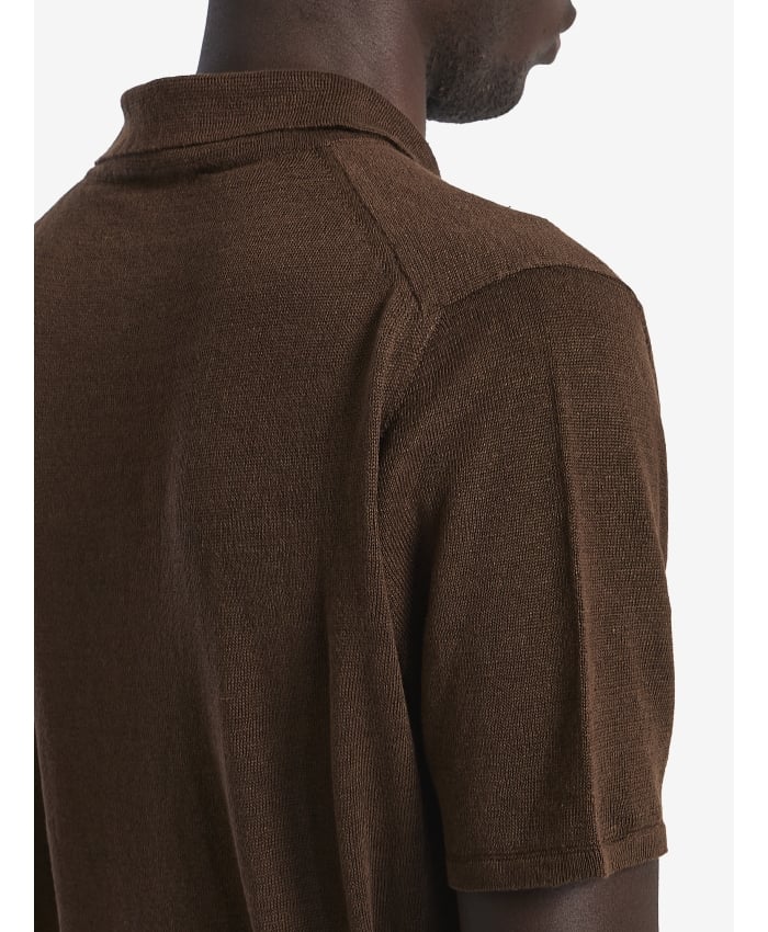 Short-sleeved polo shirt in chocolate-colored linen knit. It features a classic collar, three-button placket, and ribbed hem.The model is 187cm tall