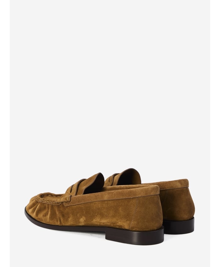 Le Loafer moccasins in cognac suede. They feature a gathered effect on the upper, a gold-tone metal Cassandre logo on the side of the right shoe, an
