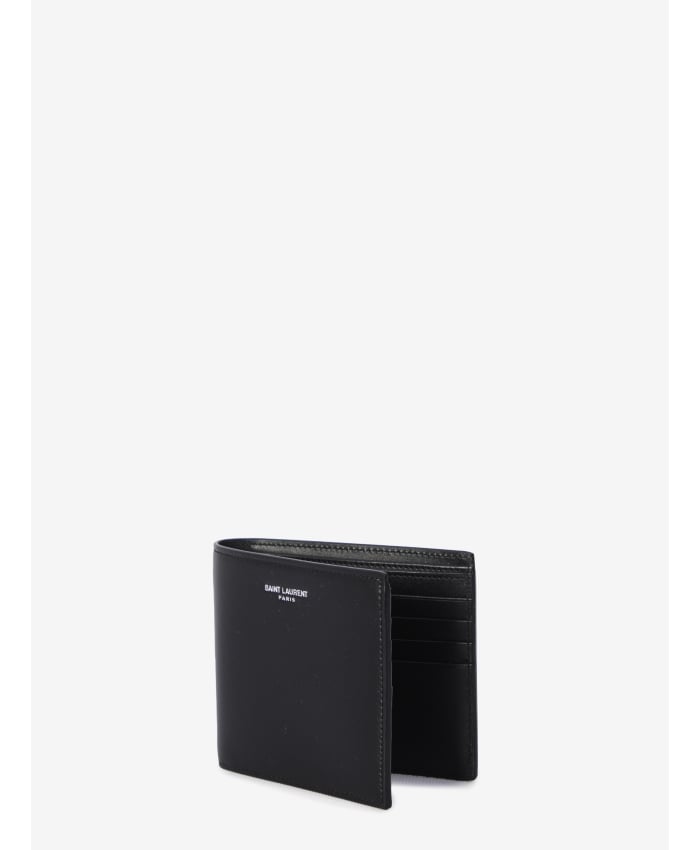 Paris East/West bi-fold wallet in black smooth leather with a Saint Laurent Paris signature. It features eight card slots, two receipt