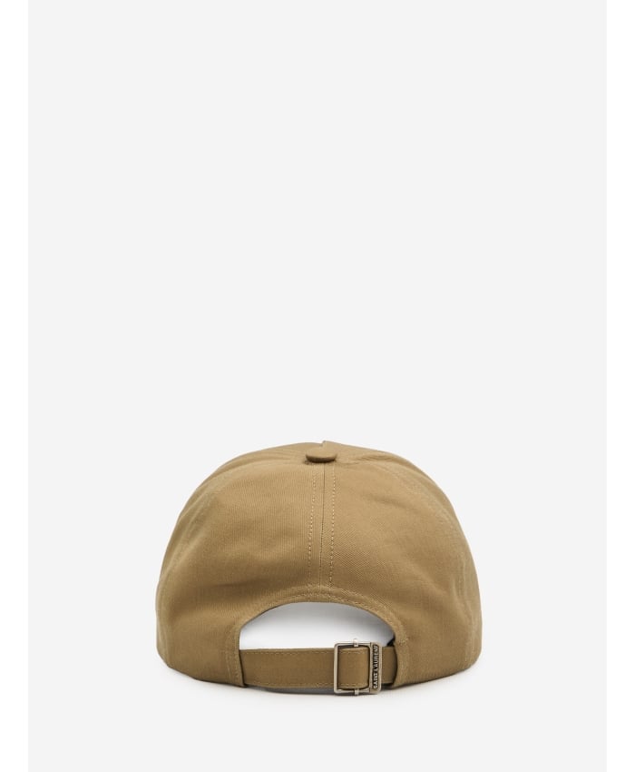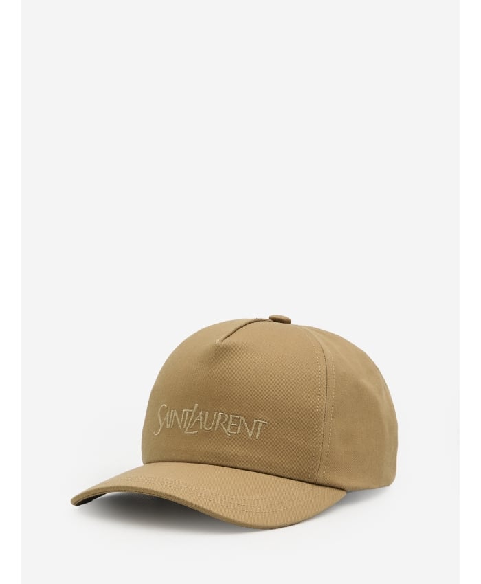 Beige cotton-linen blend baseball hat with tonal embroidered Saint Laurent logo on the front. Adjustable buckle strap with embossed logo on the back.