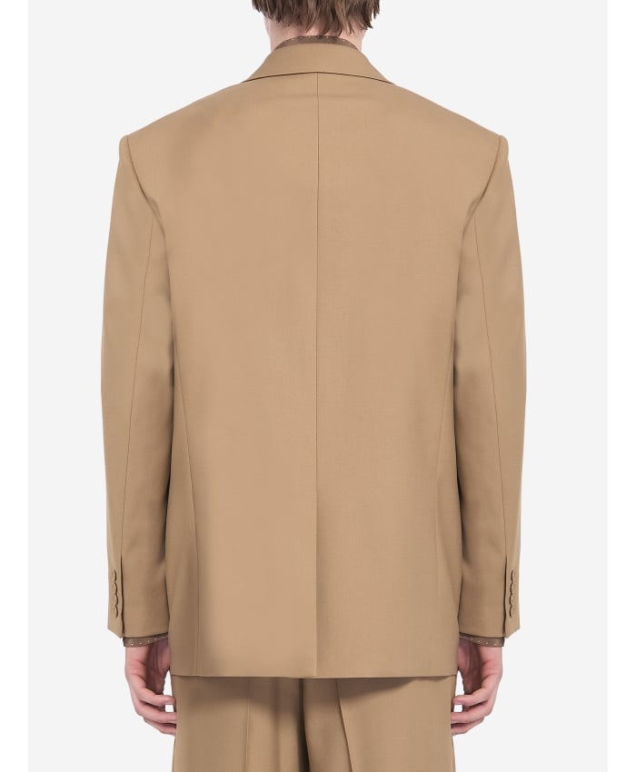 Single-breasted khaki wool jacket. It features a two-tone button closure, classic lapels, two flap welt pockets at the front, a piped chest pocket,
