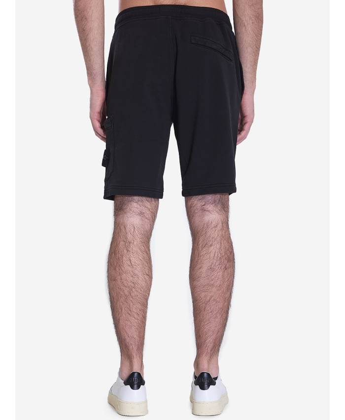 Black organic cotton fleece cargo bermuda shorts. They feature an elasticized waistband with a drawstring and zip, two side pockets, a zippered