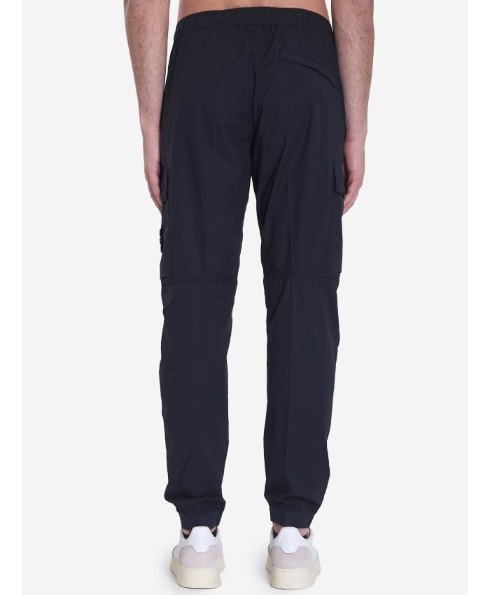 Dark blue cargo pants in lightweight stretch cotton Parachute canvas. It features an elasticated waistband with drawstring and zip, two side zip
