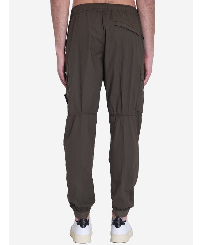 Military green cargo pants in lightweight stretch cotton Parachute canvas. It features an elasticated waistband with drawstring and zip, two side zip