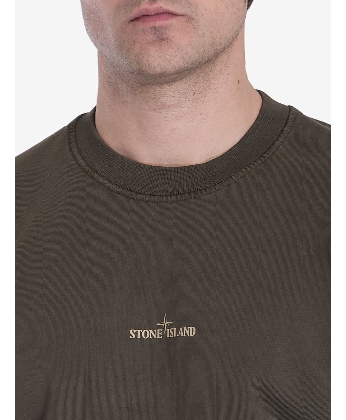 Military green cotton crewneck sweatshirt. It features an Institutional Five print on the back, a printed Stone Island logo on the front, and ribbed