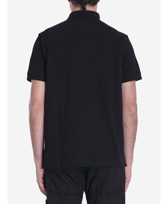 Short-sleeve polo in black organic cotton pique. It features a classic collar, a two-button placket, a Stone Island Compass patch on the chest,