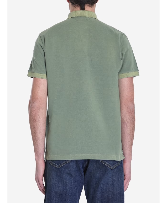 Short-sleeve polo shirt in organic pique cotton, green. It features a classic collar, two-button placket, tone-on-tone Stone Island Compass