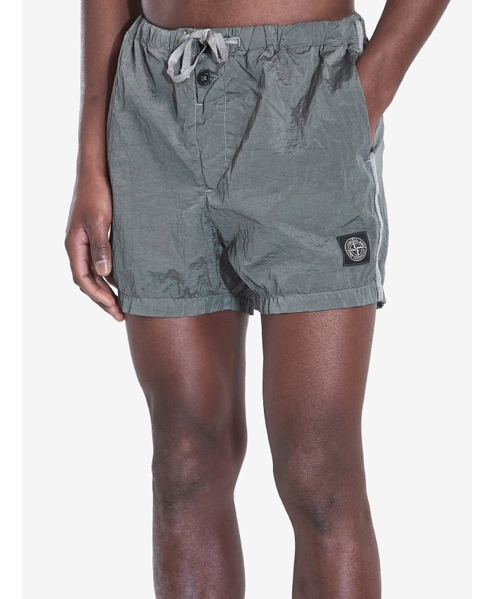 Short swim trunks in military green metallic nylon with a mesh inner lining. They feature an elasticized waistband with drawstring, button closure,