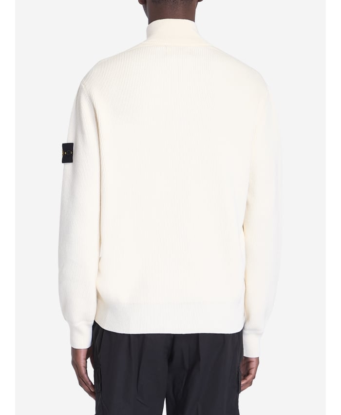 Avory white ribbed organic cotton sweater. It features a high, rigid ribbed collar, a zip closure, a Stone Island patch on the left sleeve, and thin