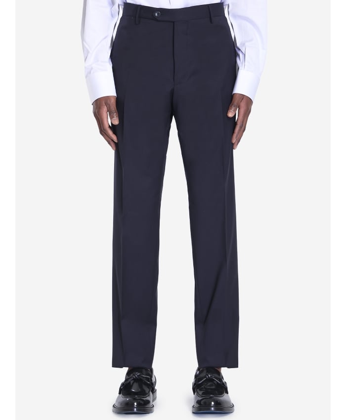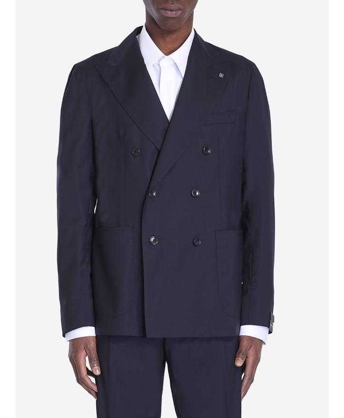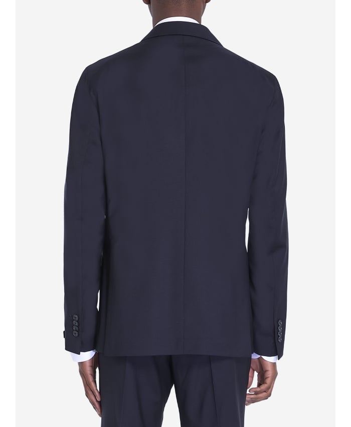 Two-piece suit in navy blue virgin wool. The double-breasted jacket features pointed lapels, a pin on the collar, front button closure, two front