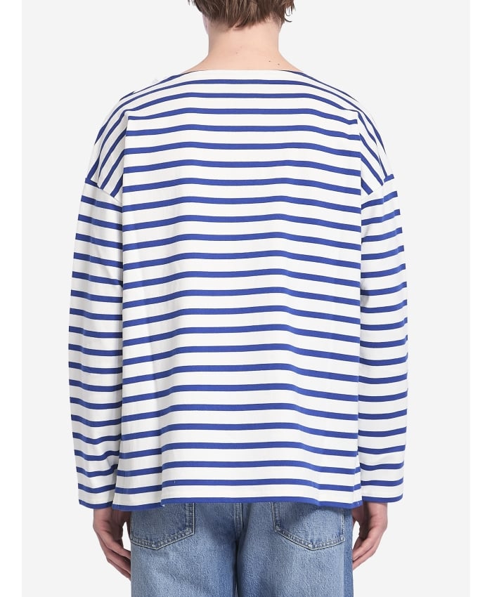 Long-sleeve t-shirt in white cotton with blue stripes. It features a wide neckline, a black Chez Valentino print on the chest, and two side slits at