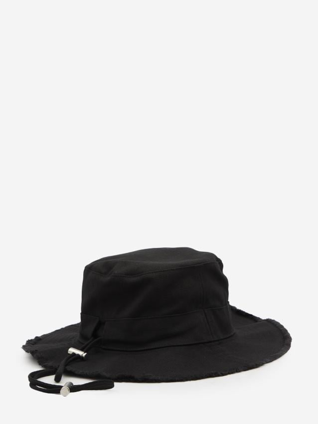 Le Bob Artichaut hat in black cotton. It features a frayed-edge brim, a silver-tone metal logo on the front, and a long adjustable chin cord.