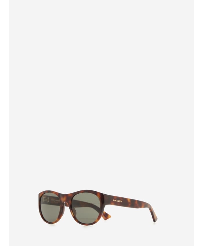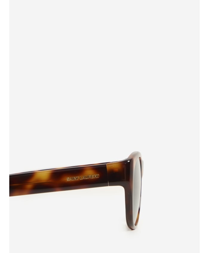 SL 798 round butterfly sunglasses with a tortoiseshell acetate frame and black lenses. They feature the Saint Laurent signature engraved on the