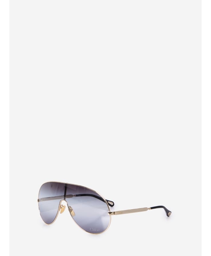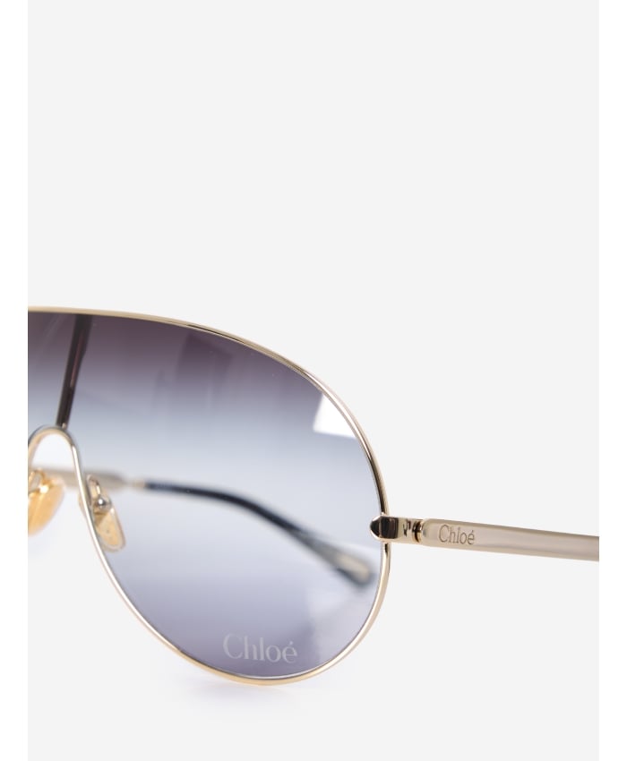 Aly aviator mask sunglasses in shiny gold metal with black gradient lenses. They feature the Chloe logo on the left lens, the Chloe logo on