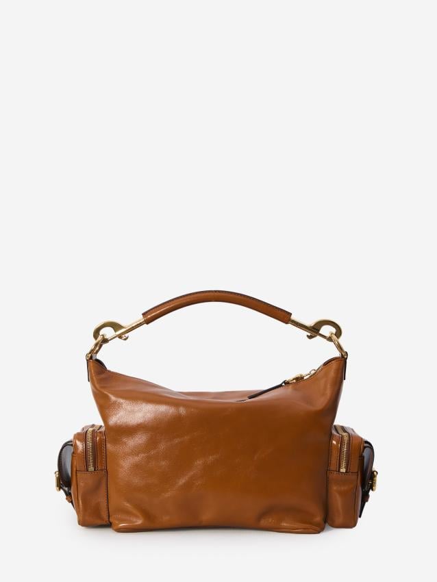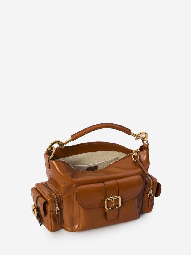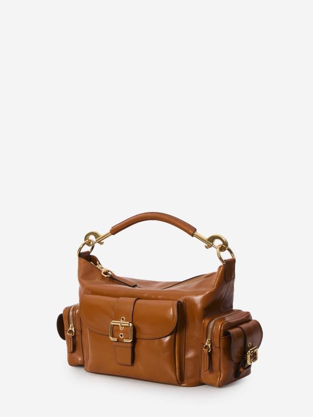 Camera bag in brown natural buffalo leather. It features an adjustable and removable shoulder strap, a removable handle, zip closure, two double side