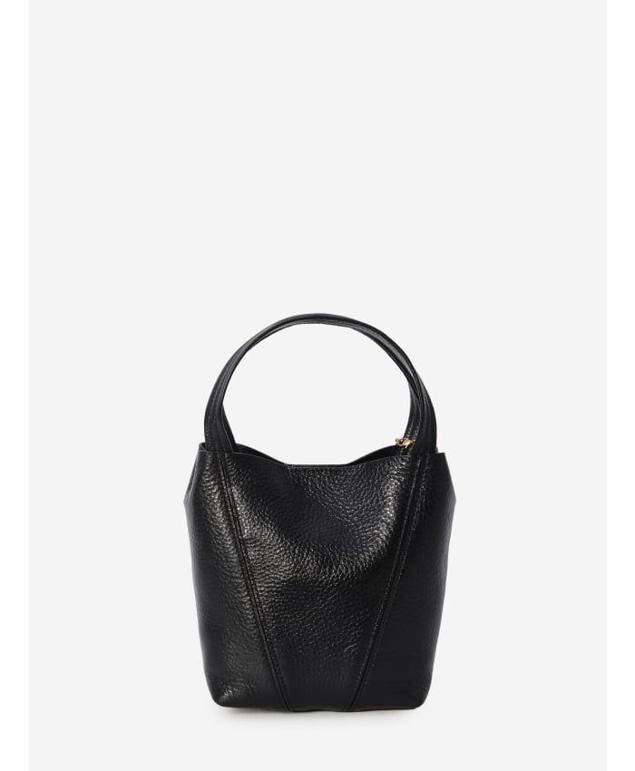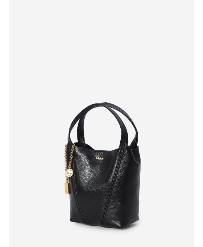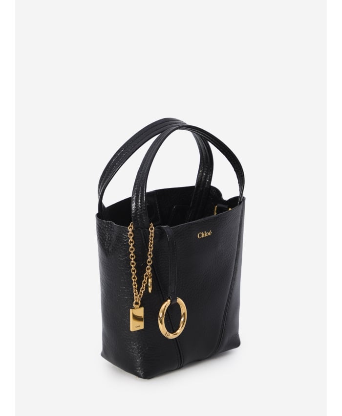 Chloé Spin small tote bag in glossy black garnet leather. It features two fixed top handles, an engraved