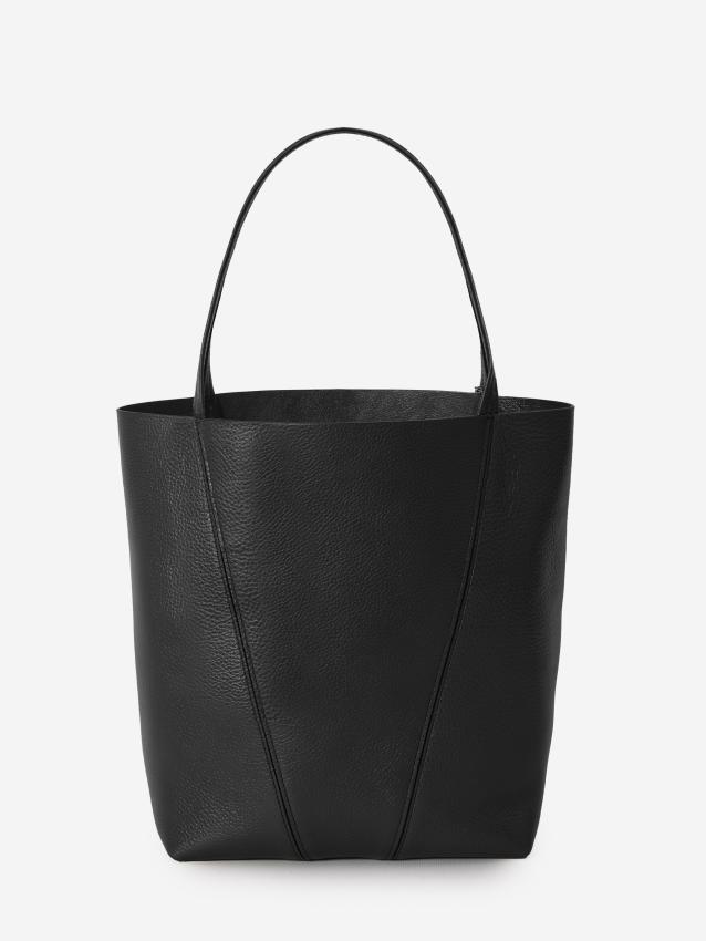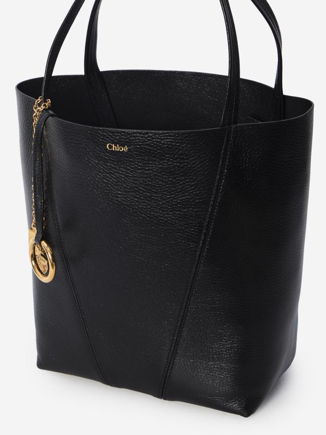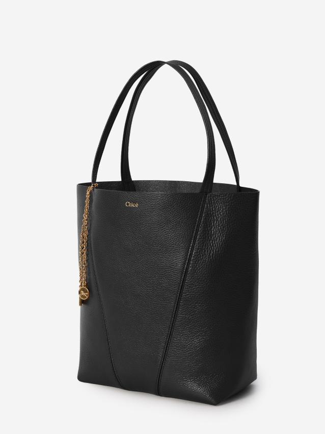 Chloé Spin tote bag in glossy black garnet leather. It features two fixed top handles, an engraved Chloé
