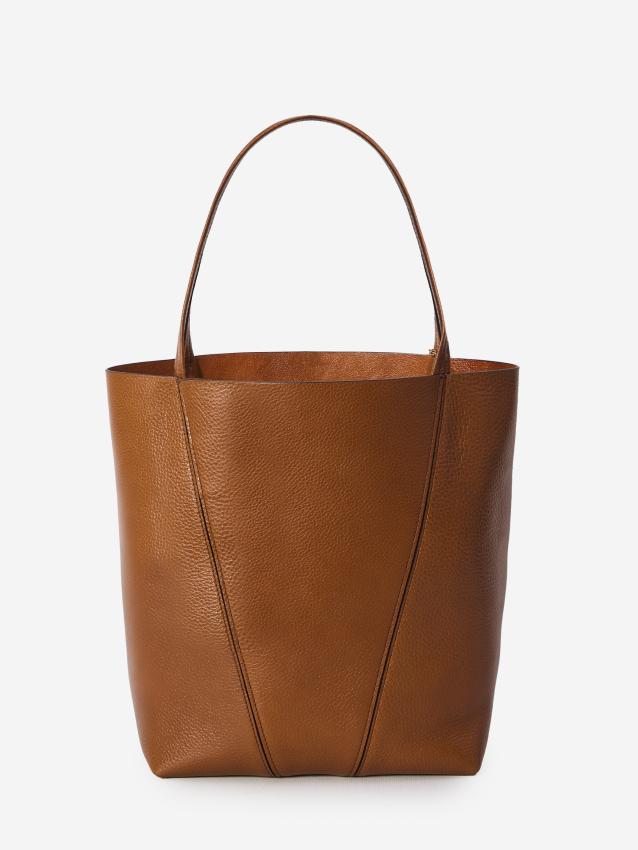 Chloé Spin tote bag in glossy brown garnet leather. It features two fixed top handles, an engraved Chloé