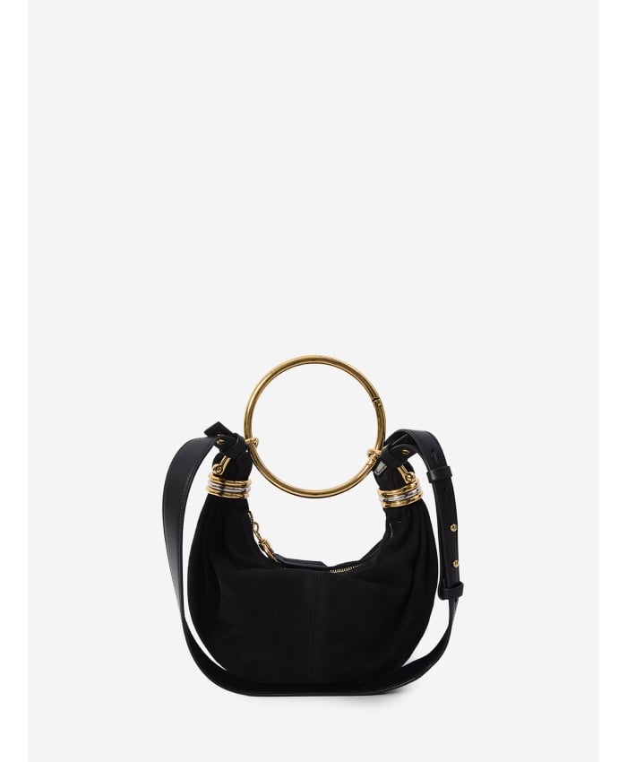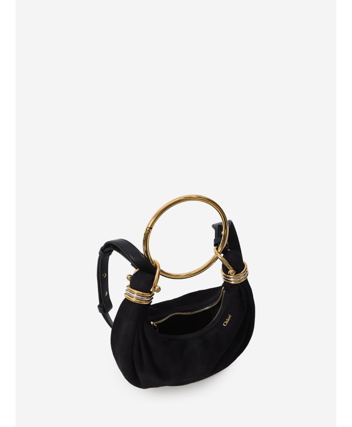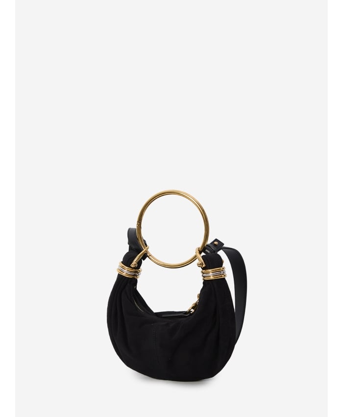 Mini Bracelet Hobo bag in black goat suede leather. It features a removable golden metal ring handle, bicolored metal rings on the sides, an
