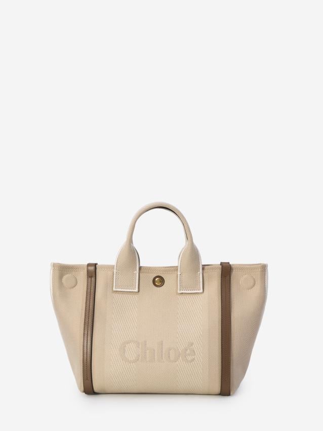 Small Carry tote bag in beige and white striped cotton jacquard canvas with contrasting brown vertical leather bands and an oversized