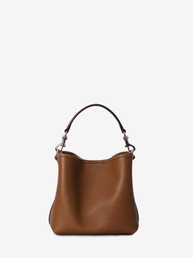 Mini bucket bag in smooth brown leather with gold embossed Gucci script on the front. It features removable top handle with gold-toned hook closure,