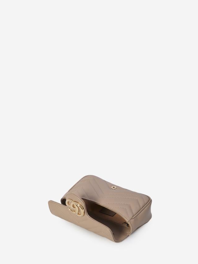 Super mini GG Marmont bag in taupe matelasse leather with diagonal quilting. It features gold-tone hardware, flap closure with snap button, GG