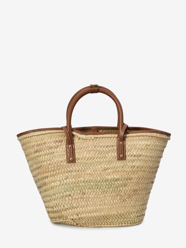 Le Panier Soli beach bag, hand-woven with smooth brown leather details. It features two fixed top leather handles with a tab and snap button, two
