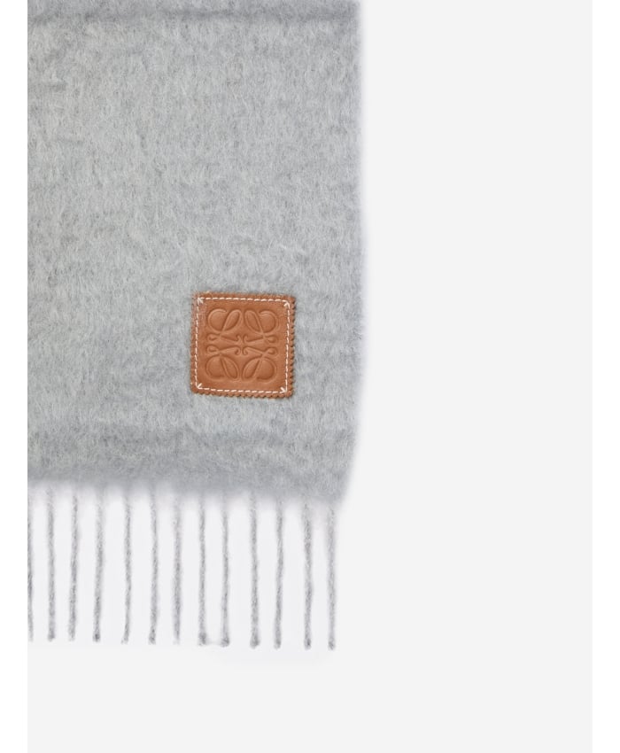 Scarf in light grey mohair and wool blend with Loewe patch in brown leather. Fringed hems.Dimensions: 23x185cm