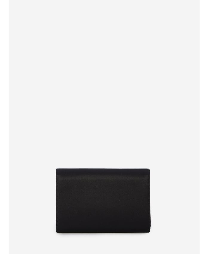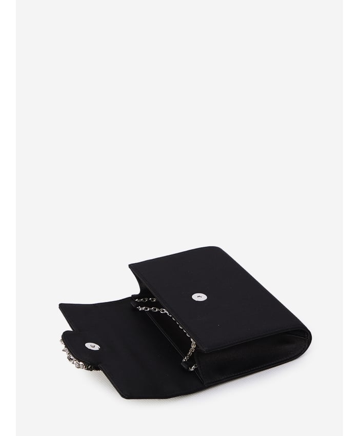 Mini clutch in black satin with an Efflorescence crystal buckle on the flap. It features a magnetic button closure, a metal chain strap, one internal