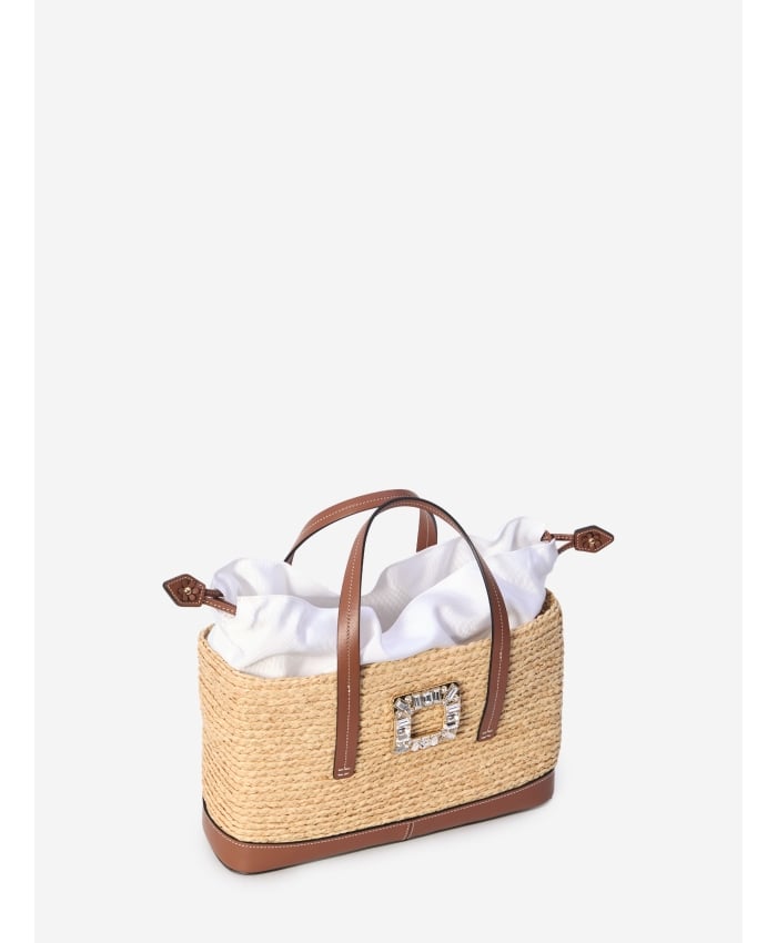 Small Viv' Skate shopping bag in raffia with brown leather details. It features two top handles, a drawstring closure with a white fabric
