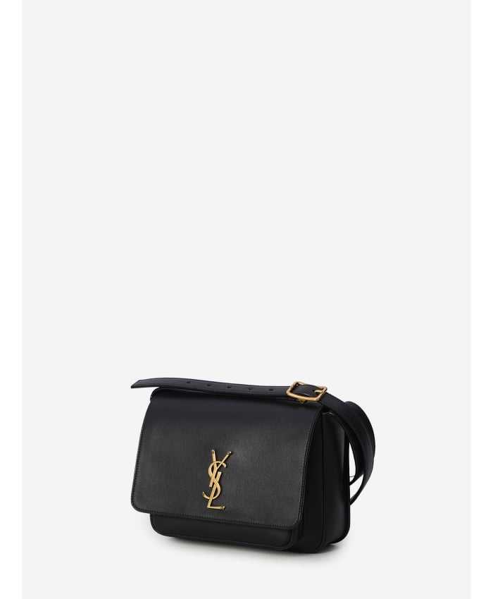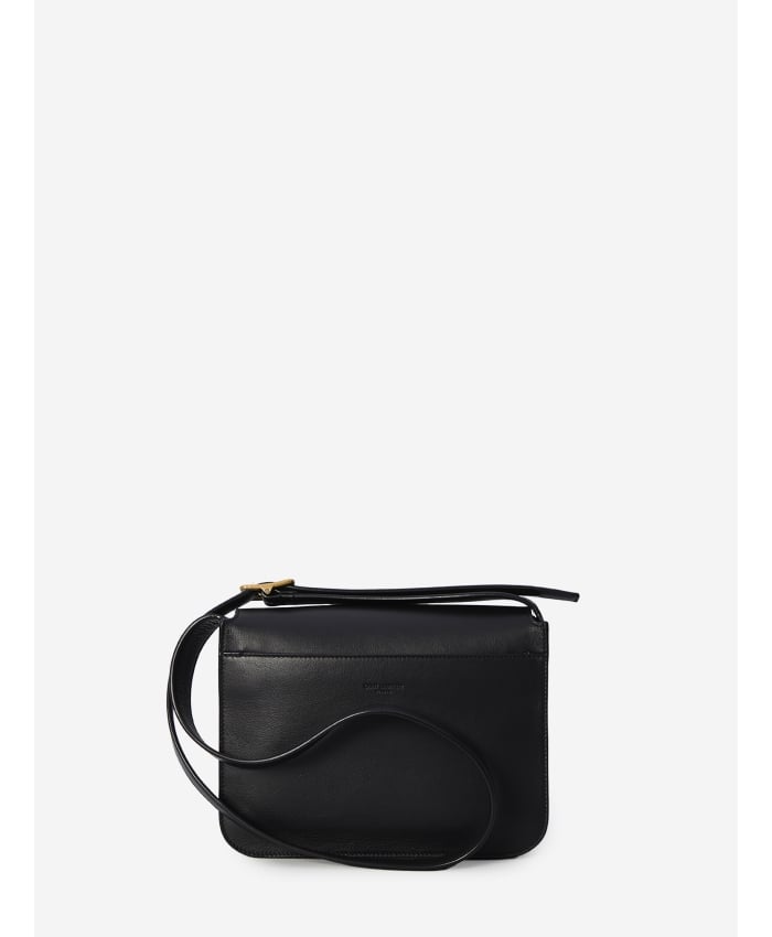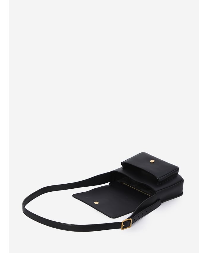 Niki saddle bag in finely hammered black leather. It features a magnetic flap closure, a bronzed metal Cassandre logo on the flap, an adjustable