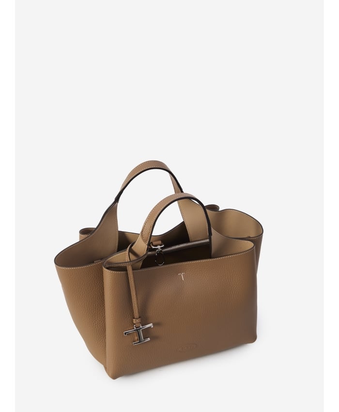 Mini bag in brown grained calfskin. It features embossed Tod's logo on the front, detachable T Timeless charm, two flat handles, adjustable and