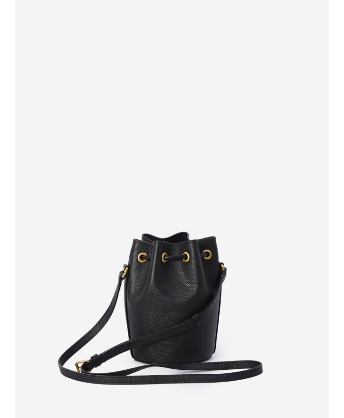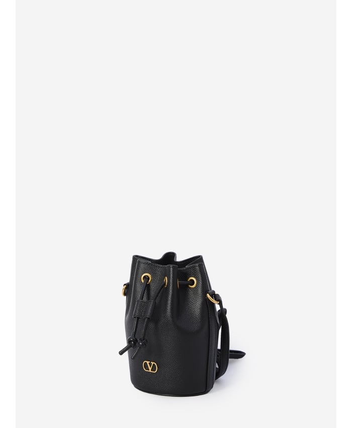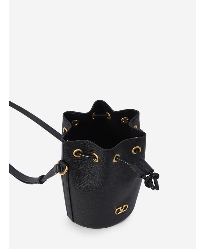 Mini bucket bag in black calfskin leather. It features a gold-finish VLogo Signature on the front, a drawstring closure, an adjustable leather strap,