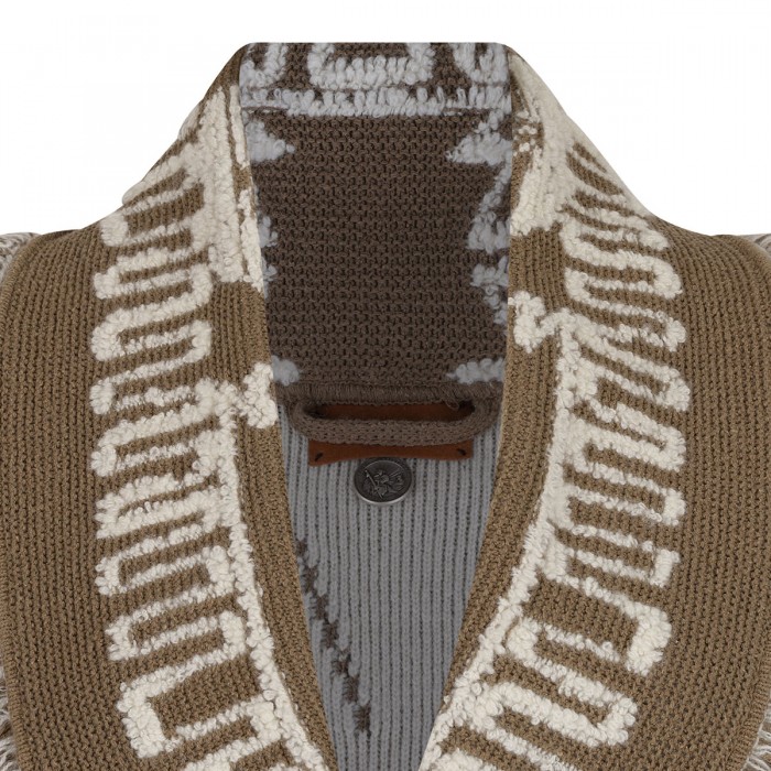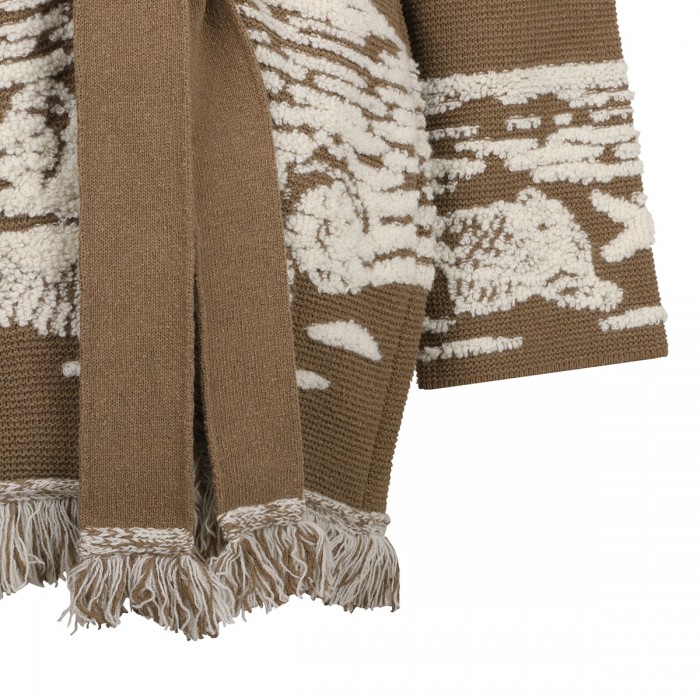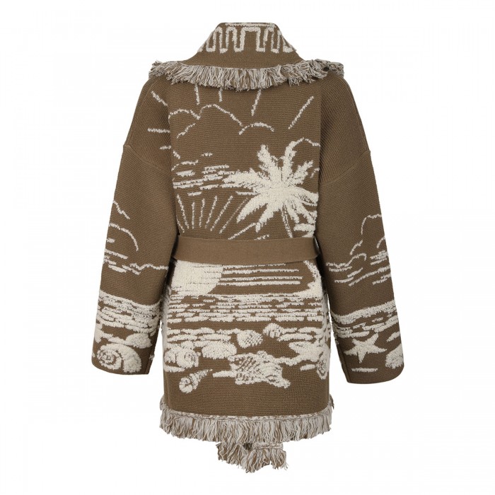 Khaki and white recycled cashmere and silk blend Beyond The Horizons cardigan from Alanui featuring Beyond The Horizons double jacquard motif, two-tone self-tie belt, matching fringed edges, icon fit, long sleeves, dropped shoulders, shawl collar.