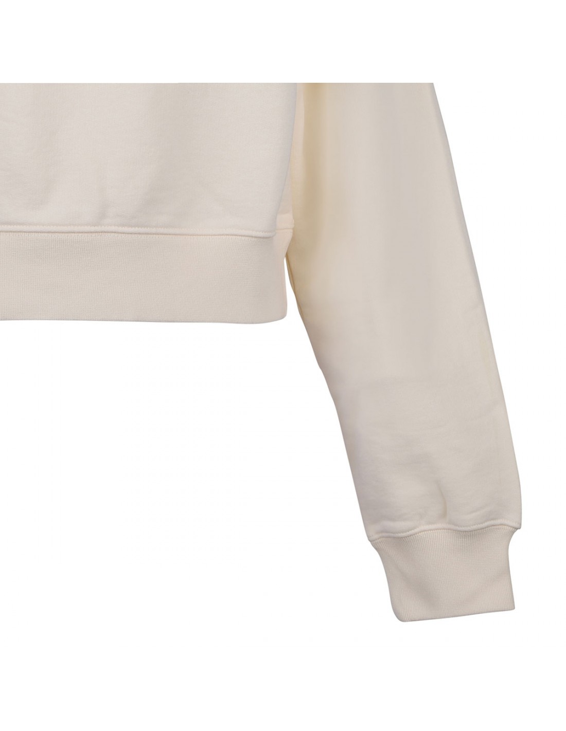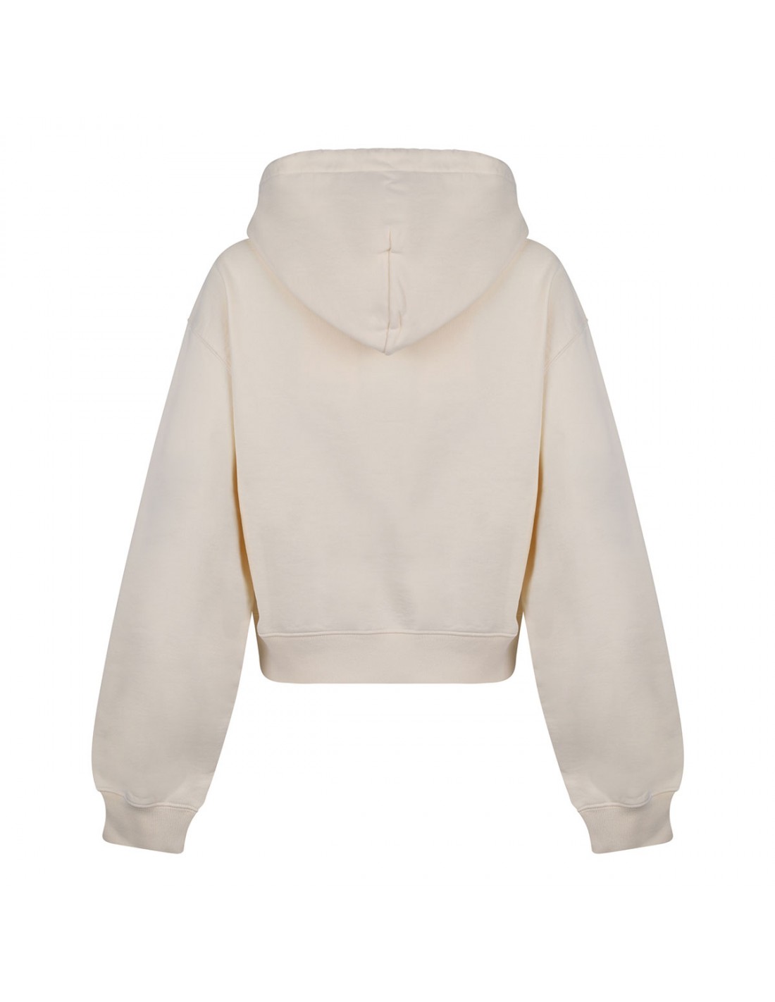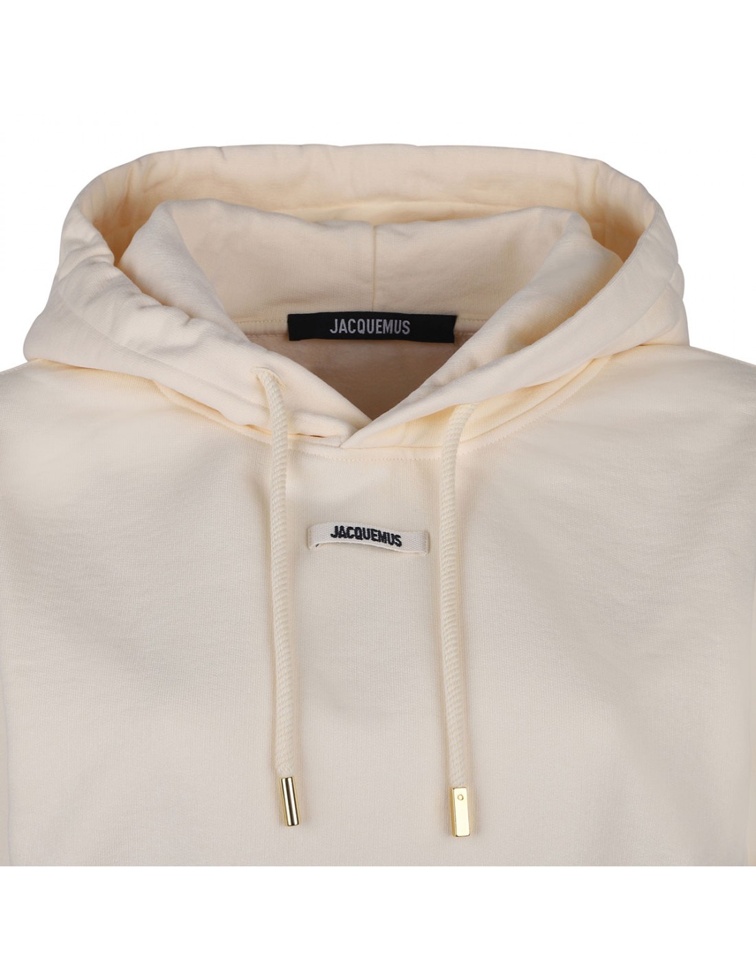 Light beige cotton fleece The Gros Grain hoodie from Jacquemus featuring cropped fit, drawstring hood with circle and square tips, embroidered grosgrain logo on chest, long sleeves, dropped shoulders, ribbed-knit edges.