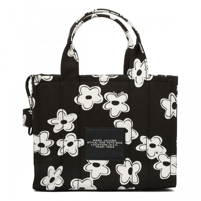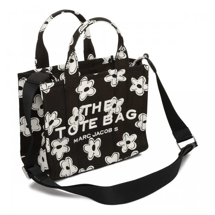 Black canvas The Daisy Canvas small tote bag from Marc Jacobs featuring screen printed daisies, screen printed logo, zip fastening along top, canvas top handles, detachable and adjustable webbing strap, faille Lining and one internal zip pocket.