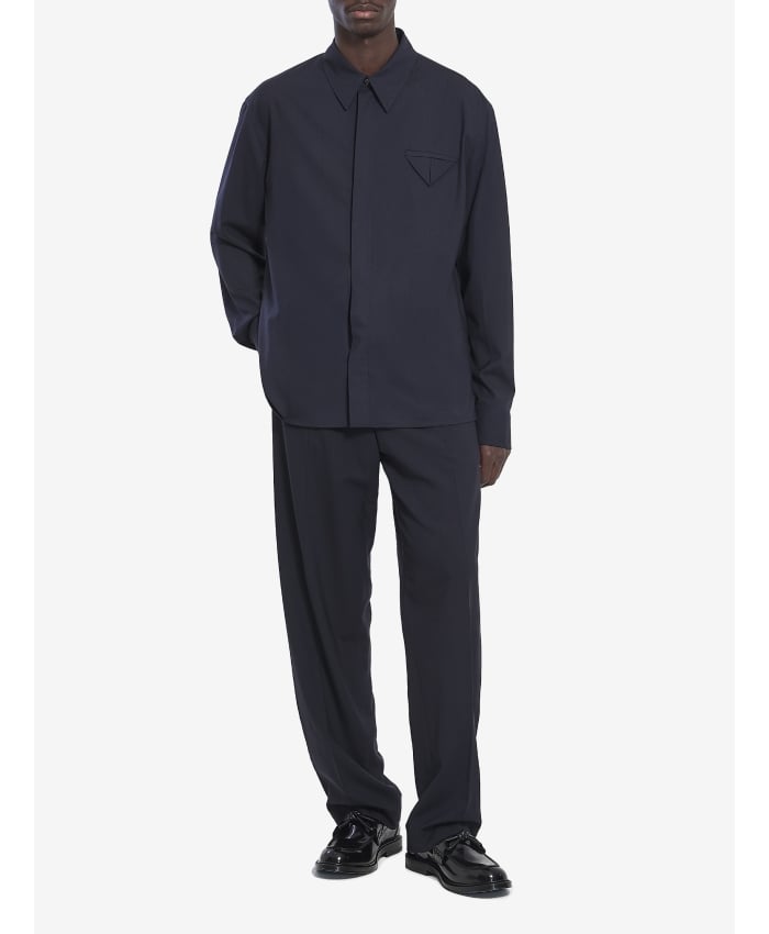 Shirt in fine midnight blue wool. It features a pointed collar, concealed front button closure, a chest pocket with a triangular flap, and a