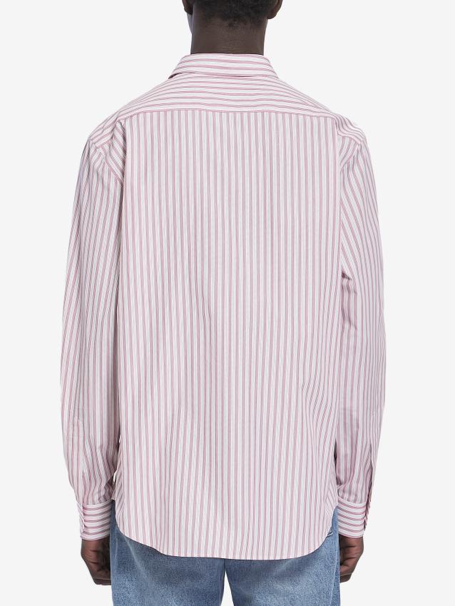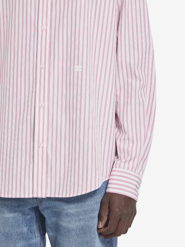White cotton poplin shirt with pink stripes. It features a pointed collar, a front button closure, an embroidered Triomphe logo in white on the