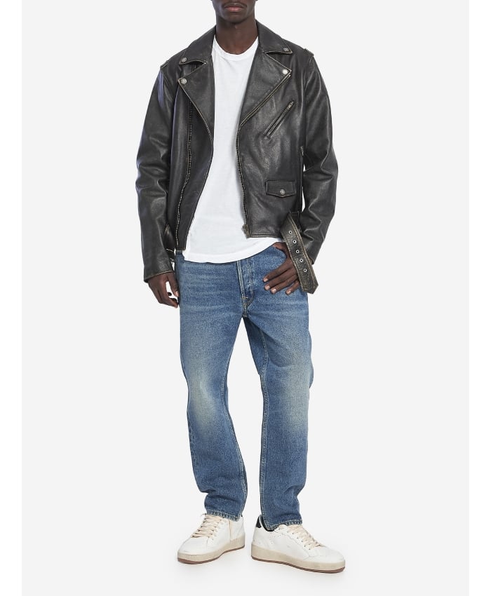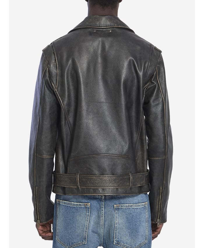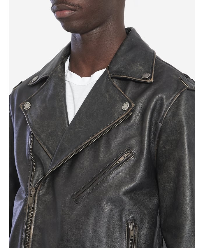 Black biker jacket in distressed calfskin leather. It features a front zip closure, a zipped chest pocket, two zipped side pockets, a small front