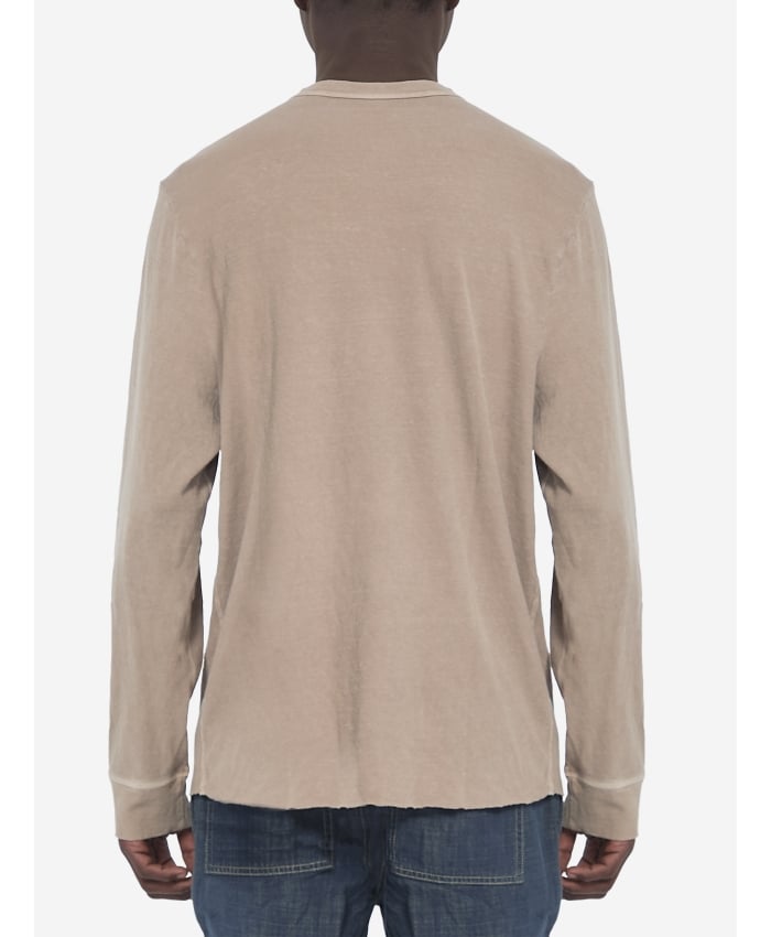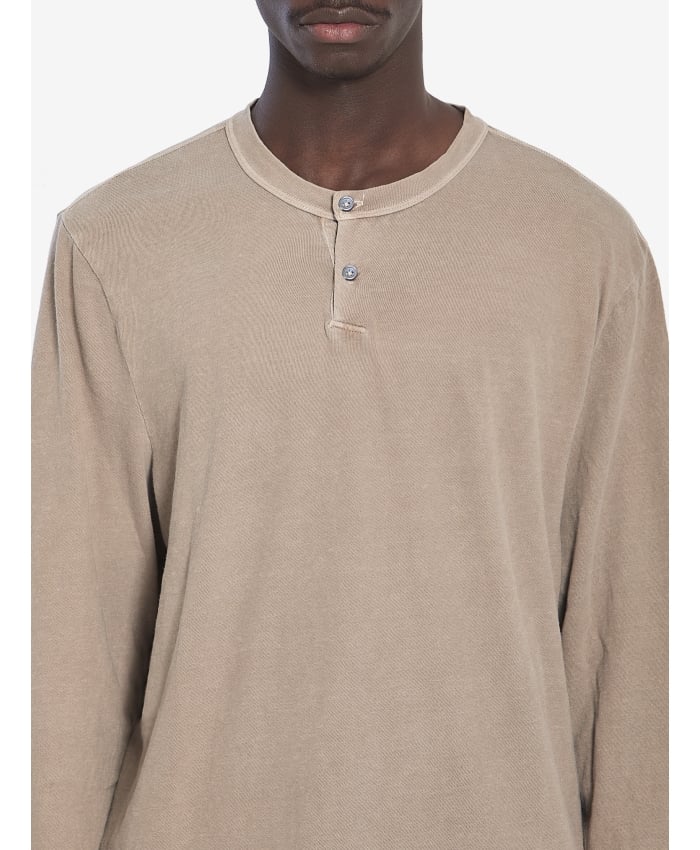 Beige lightweight slub Henley crewneck short-sleeve jersey. It features a placket with three buttons, ribbed cuffs and neckline, and a raw hem.